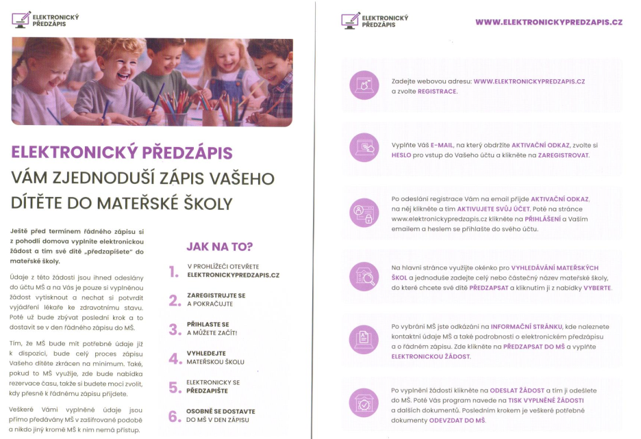 pro usnadnění a urychlení zápisu Vašeho dítěte do naší mateřské školy můžete využít Elektronického předzápisu. Na webu: www.elektronickypredzapis.cz stačí vyhledat naší mateřskou školu, zaregistrovat se a předzapsat se do ní. Je také možno využít přímý odkaz na informační stránku naší mateřské školy: